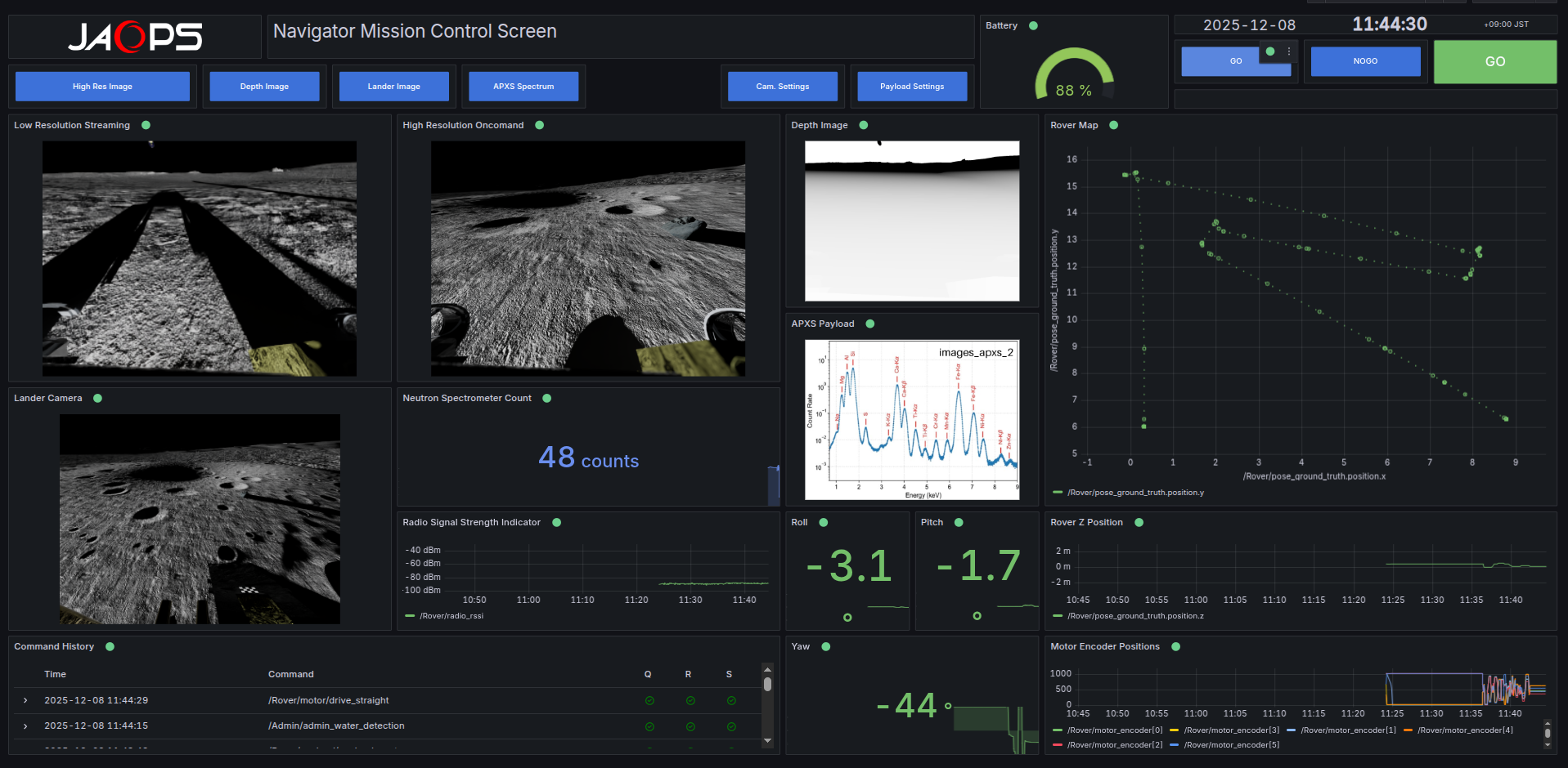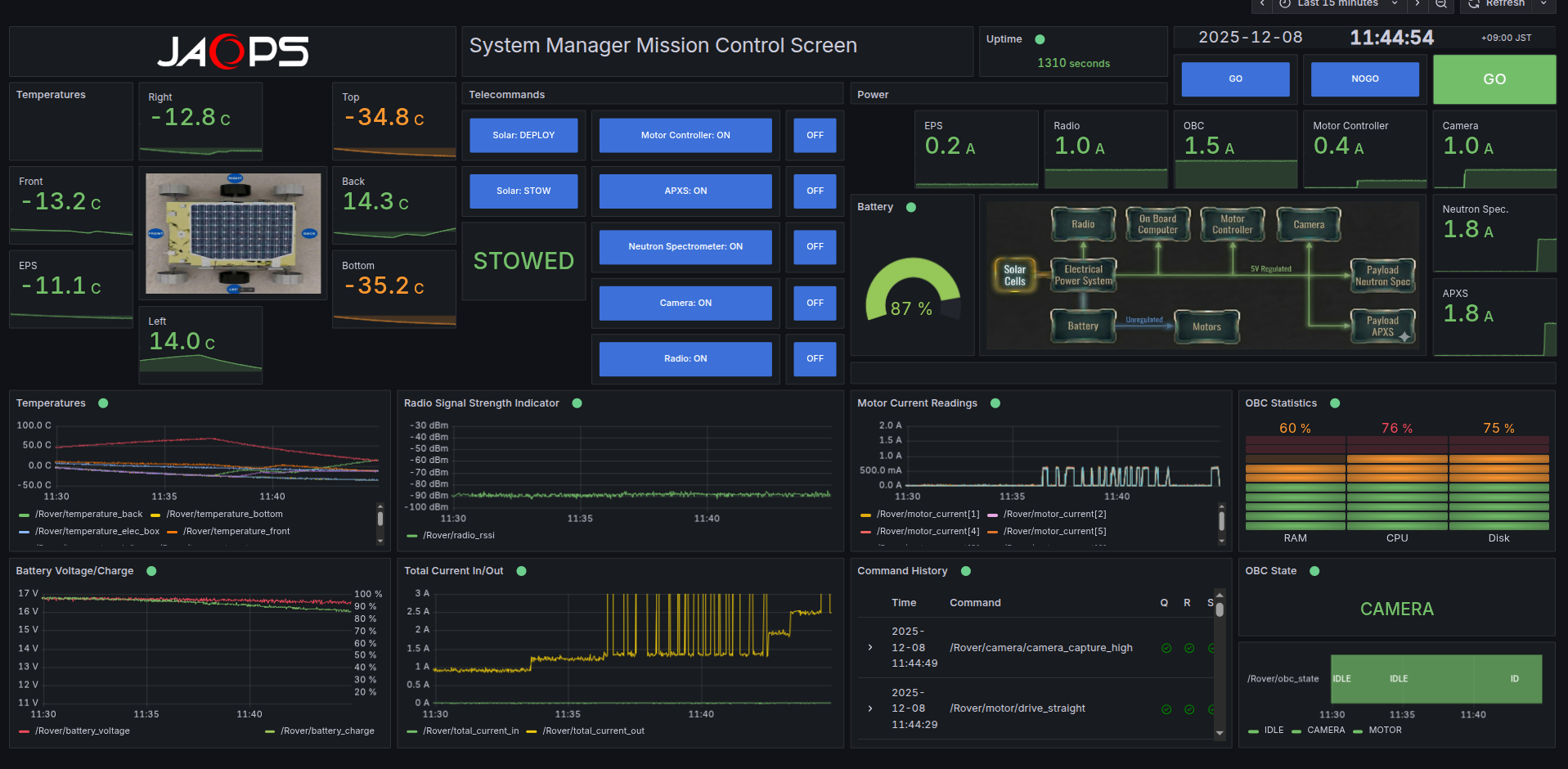 This demo showcases the full training workflow: operators sends telecommands, the simulated rover reacts in realtime and updates the camera, payload, power, thermal, motor, radio telemetry for realistic decision making and scenarios.